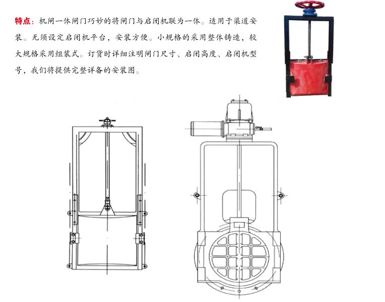 機閘一體式閘門 鑄鐵閘門是一種小型平板閘門,廣泛使用于取水輸水、市政建設,給水排水、農田灌溉等工程中,通常設置在渠道、涵管的進水口,用作工作閘門調節流量、控制水位,或用作檢修閘門關閉孔口擋水。