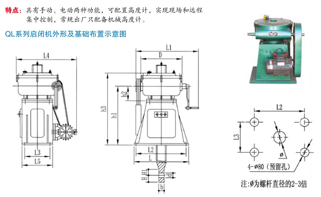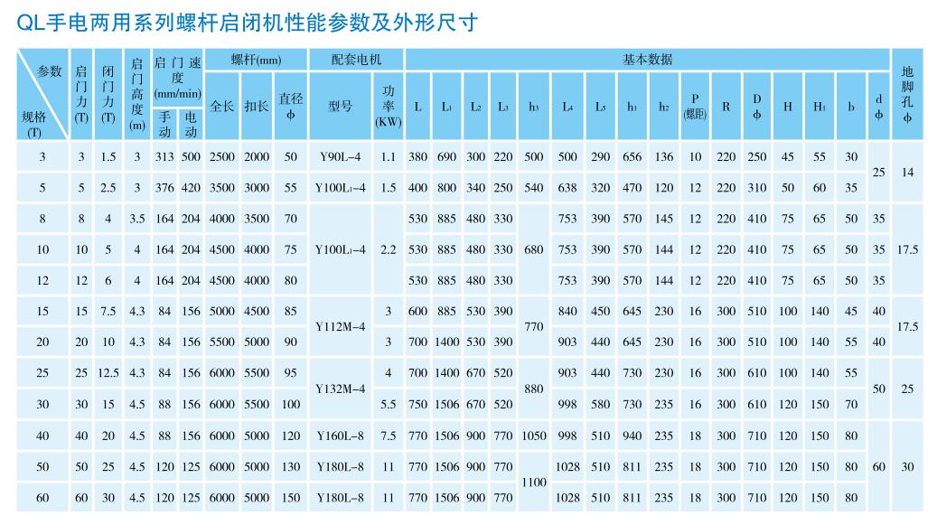 本系列啟閉機未作特殊設計時,不能作斜吊運行。 手電30KN以上的啟閉機可增設行程限位裝置,作*運行保護。手動啟閉機均設有限運盤。開始設產前進系列螺桿啟閉機機。此機器為單級螺桿啟閉機機。QL直聯式螺桿啟閉機等四個系列。均分單、雙吊點,單獨、集中驅動,和手搖(卷揚啟閉機2X250KN以下有)、電動兩用。